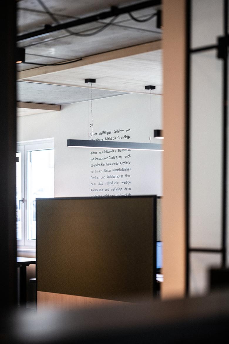 Das offene Bürokonzept wurde sorgfältig geplant, um eine optimale Arbeitsumgebung zu schaffen. Neben einem großzügigen Besprechungsraum und einem Einzelbüro umfasst es sechs kleinere Arbeitskojen. Diese bieten den Mitarbeitenden eine ideale Balance zwischen Privatsphäre und ungehindertem Arbeiten, und der Kommunikation und dem Austausch untereinander. Die individuellen Arbeitsbereiche sind geschickt in den Raum integriert und bieten vielfältige Gestaltungsmöglichkeiten.