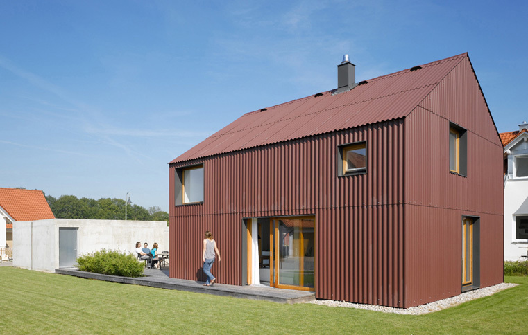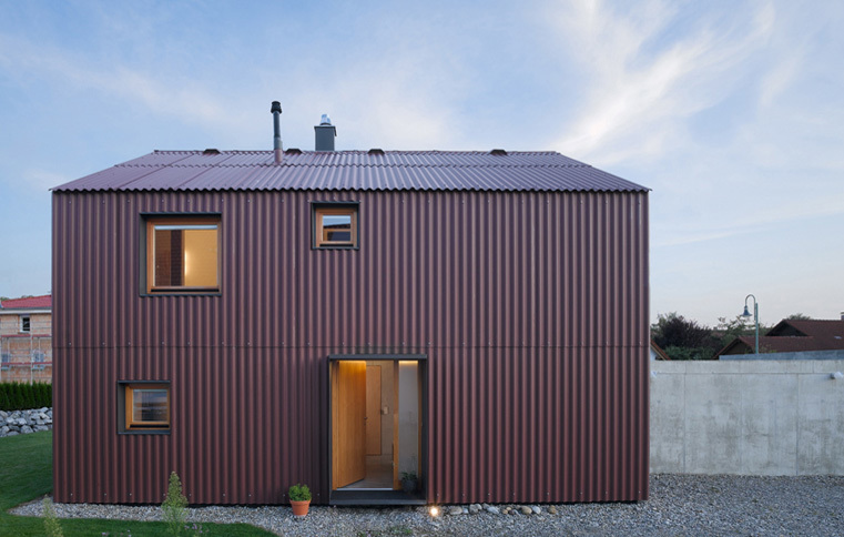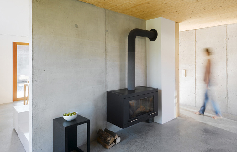 Das Wohnhaus für 125.000.- Euro wurde für zwei Bewohner mit einer Wohnfläche von 90m2 konzipiert. Die Entscheidungen, zur Konstruktion des Gebäudes, der Materialauswahl und Verarbeitung waren maßgeblich von den Baukosten beeinflußt. Der Holzbau stellt mit seinen präzise gesetzten Öffnungen im Erdgeschoss einen starken Bezug zu den Aussenbereichen her. Über dem Essplatz ist ein Luftraum ausgespart der die Geschossebenen großzügig miteinander verbindet. Die Holzterrasse zwischen Wohnhaus und Garage bietet einen privaten Aussenraum der nach Norden mit einer Betonwand und nach Süden mit einem Pflanzbecken abgeschirmt wird. Das kleine Wohnhaus zeigt eine kostengünstige Alternative zu den marktüblichen Hauskonzepten auf.