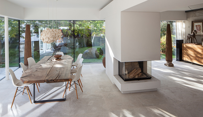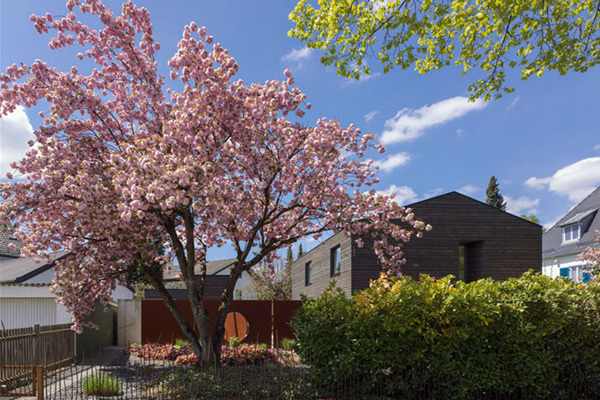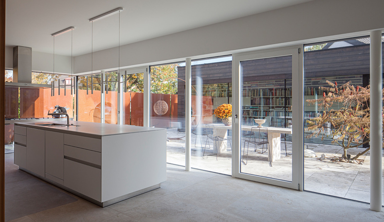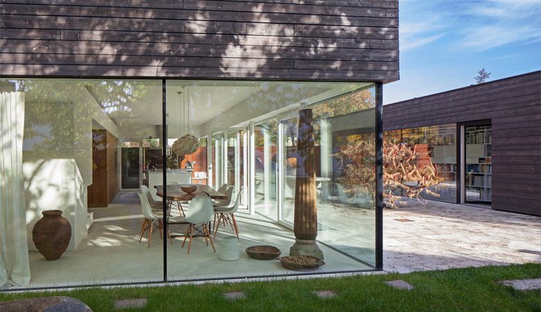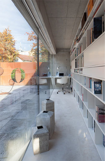 Statt eines klassischen Einfamilienhauses entstand in Pullach bei München ein Ensemble aus mehreren Bauten. Das zweigeschossige Wohngebäude mit Satteldach umfasst ein loftartiges, fast völlig offenes Erdgeschoss mit großzügigen Glasfronten sowie eine obere Etage mit Bädern und Schlafzimmern. Dem Wohngebäude ist ein eingeschossiges L-förmiges Gebäude gegenübergestellt, das als Bibliothek und Arbeitsplatz dient. Dazwischen ergibt sich ein privater Innenhof, der durch eine freistehende Wand aus Stahlplatten zur Straße hin abgeschirmt wird und vor unerwünschten Einblicken schützt. Trotz großer Transparenz entsteht durch klar definierte und zueinander in Beziehung stehende Innen und- Aussenräume ein zeitgemäßer Lebensraum, der zugleich Offenheit und Rückzug ermöglicht.