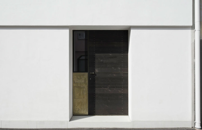 Eine Lochfassade mit geschossweisem Versatz der Giebelwand interpretiert auf einfache Weise historische Themen des Verzierens und Gestaltens.