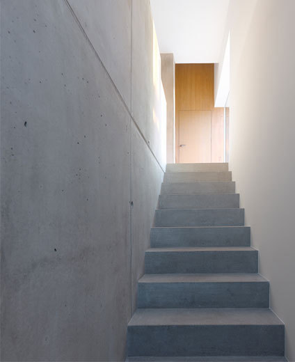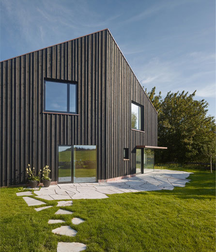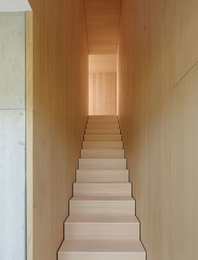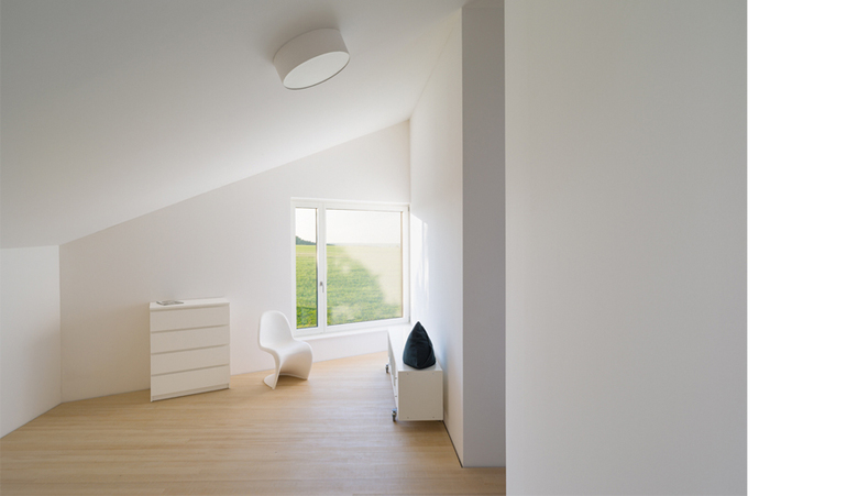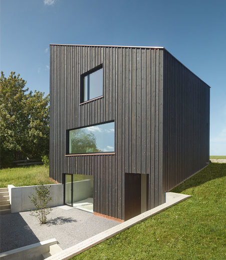 Die Höhenlage des Grundstücks am Rand der kleinen Gemeinde südlich von Landsberg ermöglicht nach Süden den Blick in die Alpen nach Norden den Blick ins Lechtal. Durch die Anordnung von Garage und Wohnhaus wurde der ursprüngliche Zustand des Hanggeländes zugunsten eines größeren Gartens kaum verändert. Der Zugangsweg überwindet entlang der Garage den Höhenunterschied und mündet in einem geschützten Kieshof. Hier befindet sich der Hauseingang und der Zugang zum Büro: eine Abkürzung führt über einige Stufen direkt in den Garten. Im nächsten Geschoss befindet sich die Wohnebene, die nach Süden über große Öffnungen den Blick übers Dorf in die Berge freigibt und nach Norden ebenerdig mit dem Garten verbunden ist. Über eine schmale Holztreppe gelangt man in die privaten Zimmer unterm Dach. Eine in Farbigkeit und Ausführung regional typische Fassadenschalung stellt einen stimmigen Ortsbezug her.