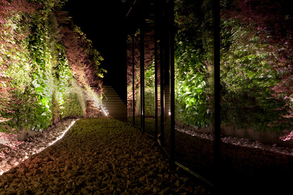 Die Umgebungsbeleuchtung um die beiden neuen Gewerbebauten in einem Industriegebiet ist als Intervention konzipiert. Die Gebäude bilden abstrakte Volumen, deren Ausdruck von den technischen Anforderungen geprägt ist. Dieser Eindruck verändert sich in der Kunstlichtsituation. Mit der Dämmerung führen spielerische Lichtpunkte die Mitarbeiter zum Eingang des rückwärtigen Bürotraktes. Die bepflanzte Rückwand bildet den optischen Hintergrund des Zwischenraums und zeichnet diese durch die vertikale Beleuchtung auch in den Innenräumen weiter. Die Akzentuierung einzelner Bäume auf dem dahinterliegenden Hügel zeigen die Tiefe des Geländes und begleiten die Wege in einer poetischen Weise.