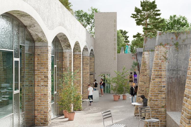 Über einen freigelegten Aussenbereich (dem sog. Senkgarten) gelangen Besuchende in ein grosszügiges Foyer zu den Innenräumen.