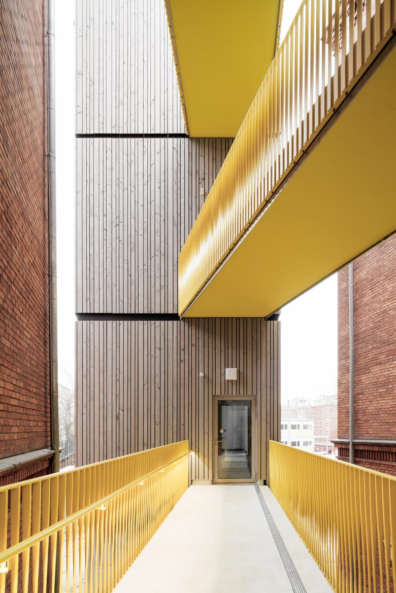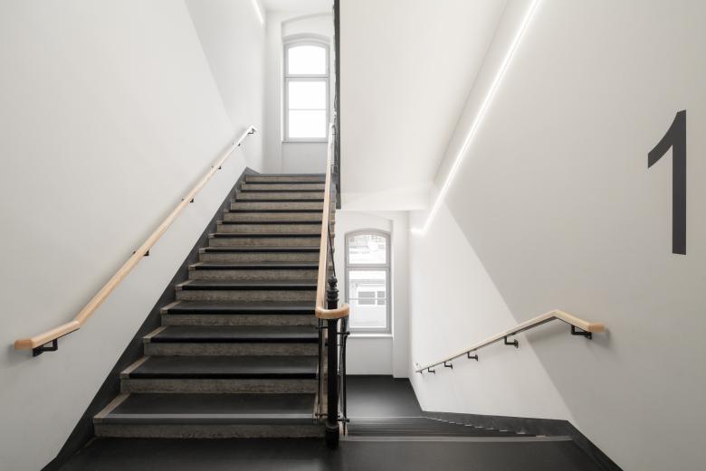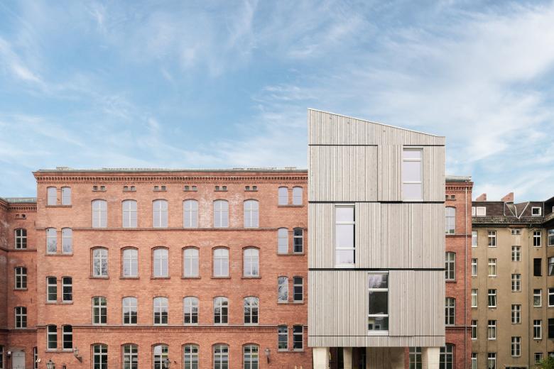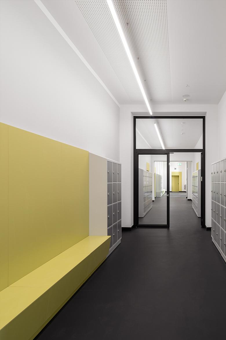 Modernisierung und Instandsetzung sowie Erweiterung der Robert-Koch-Oberschule, finanziert im Rahmen des Förderprogramms “Lebendige Zentren und Quartiere” (ehemals „Städtebaulicher Denkmalschutz“). Die Maßnahme umfasst eine Optimierung der Grundrissstruktur, die Neuausstattung aller Naturwissenschafts-Räume, die denkmalgerechte Sanierung der Dachflächen, Erneuerung aller technischen Anlagen und Ertüchtigung des Brandschutzes. Ferner die Herstellung der Barrierefreiheit sowie die Realisierung eines neuen zeitgemäßen Innenraumkonzepts. Das, im Rahmen des Möglichen auf eine zukunftsweisende Schulpädagogik hin entwickelte Brandschutzkonzept, ermöglicht die Möblierung der breiten Flurzonen und somit die Erweiterung der bisherigen Nutzflächen zu Lern- und Arbeitszwecken. Auf der Hofseite ist ein 3-geschossiger, aufgeständerter Erweiterungsbau entstanden, welcher vom historischen Gebäude abgerückt und mit offenen Stegen mit diesem verbunden wird. Dieser, in zeitgemäßer Formensprache und mit einer Holzfassade bekleidete Baukörper, beherbergt Sonderräume der Schule sowie den zur barrierefreien Erschließung des Bestandsgebäudes erforderlichen Aufzug. Plastizität erhält der Baukörper durch außen liegende bewegliche Schiebeelemente, die vor der Fassadenbekleidung verlaufen. Die manuell zu bewegenden Holzelemente dienen sowohl als Blendschutz und Sonnenschutz.