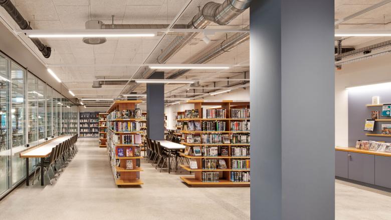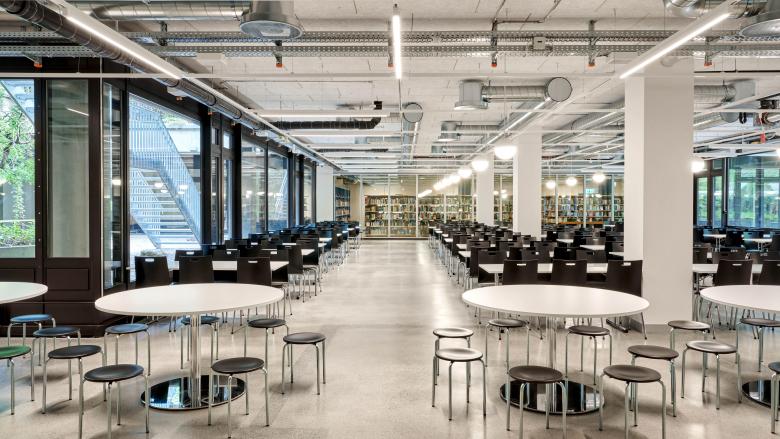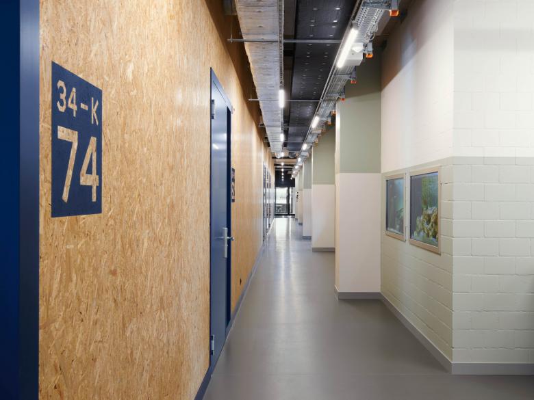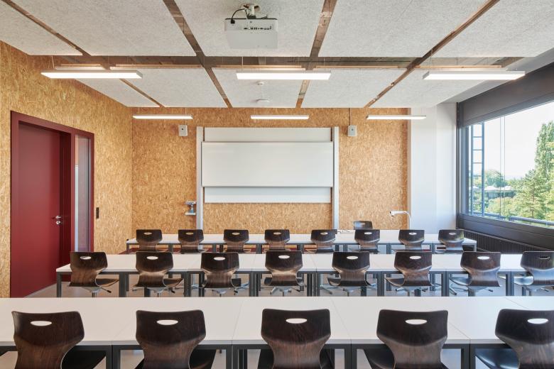 Die Nutzungsänderung erfordert tiefgreifende Sanierungsmassnahmen, um die aktuellen Normen zu erfüllen. Unangetastet bleibt die dunkle Metallfassade. In den Unterrichtszimmern kontrastiert diese mit den hellen Oberflächen der neuen Linoleumböden und holzbeplankten Wände. Geometrische Muster und viel Farbe lockern die langen Korridore auf und helfen der Orientierung. Verspielt präsentiert sich auch das zu Mensa und Mediathek umfunktionierte Hofgebäude. Auf dem rohen Boden der Mensa sind die Spuren der alten Laborwände ablesbar, während sich bei der dazugehörigen WC-Anlage der Blick in die Zukunft richtet: Hier finden sich die ersten Unisex-Toiletten einer Zürcher Schule. Zwischen den Laborbauten verfügt der Schulbetrieb über einen eigenen Aussenraum, der als Pausenhof dient. Er erstreckt sich über die zwei Gebäudeflügel hinaus und weitet sich zu einem informellen Grünraum mit Parkcharakter. Sträucher und Steine sorgen für eine natürliche Abschirmung vom Unicampus.