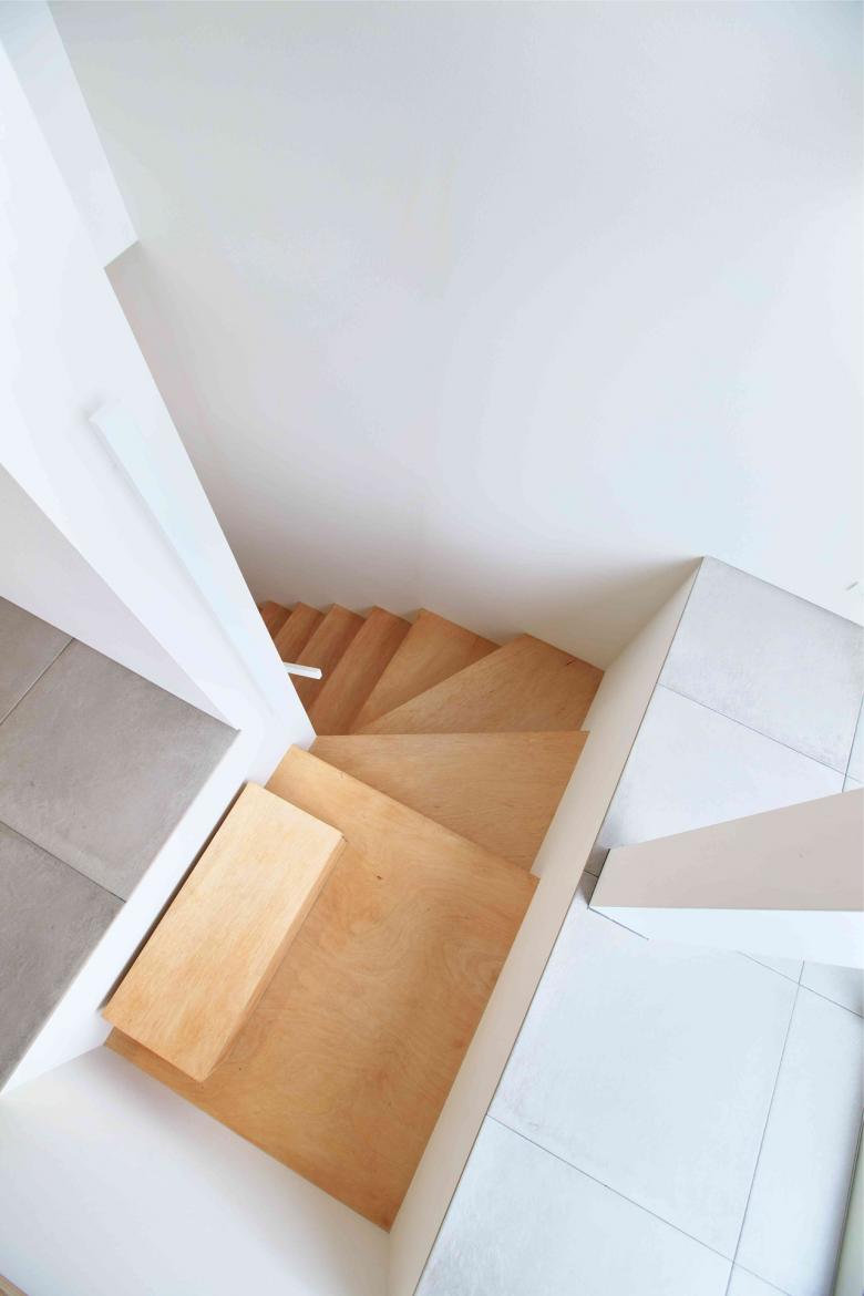 室内をコンパクトにし外周部には3Fのエントランスまで続く長い回り階段や複数のテラスを配置し、大きく長い風除室、サンルームとして機能するバッファゾーンを計画。
