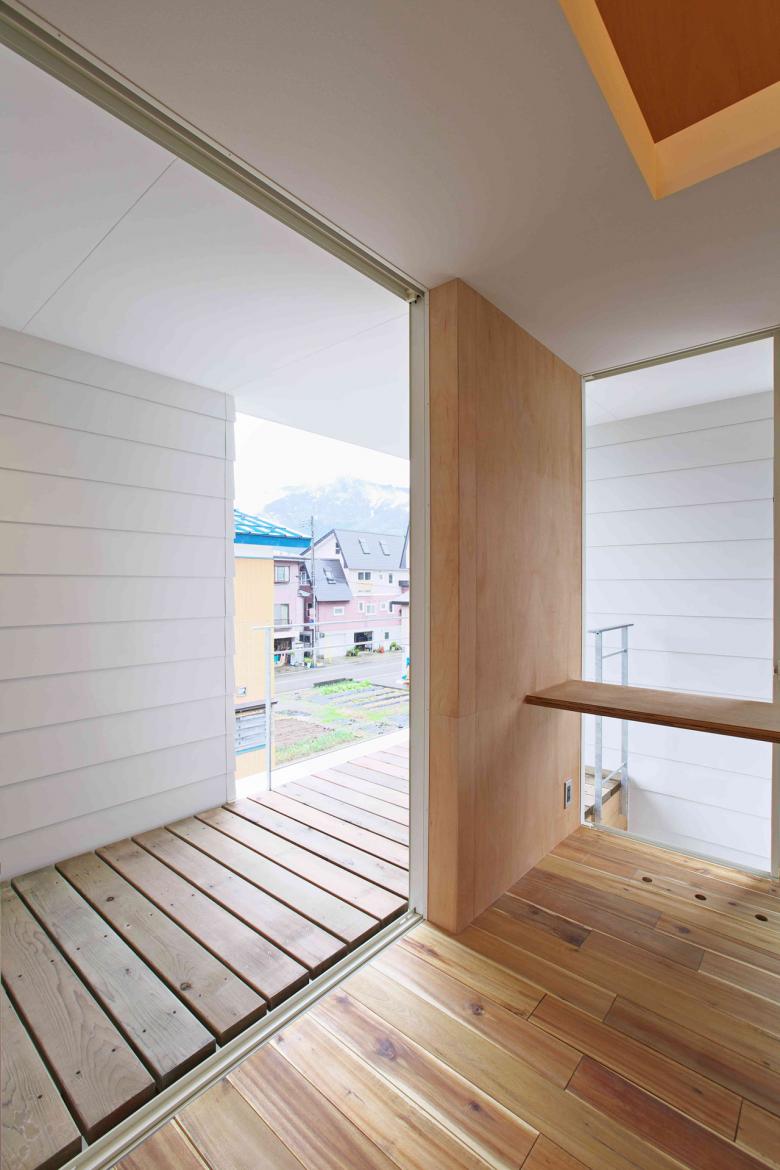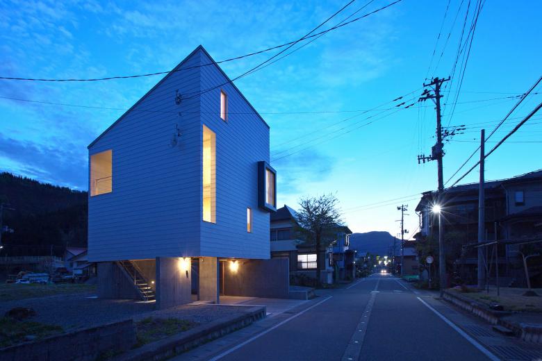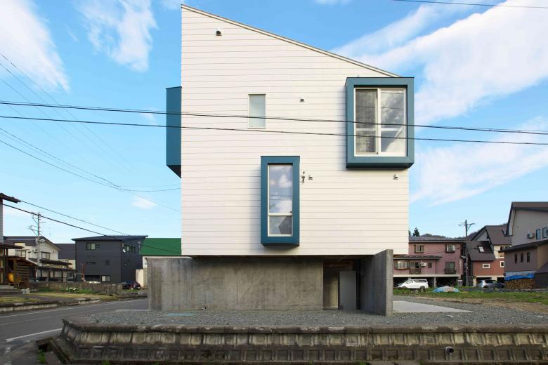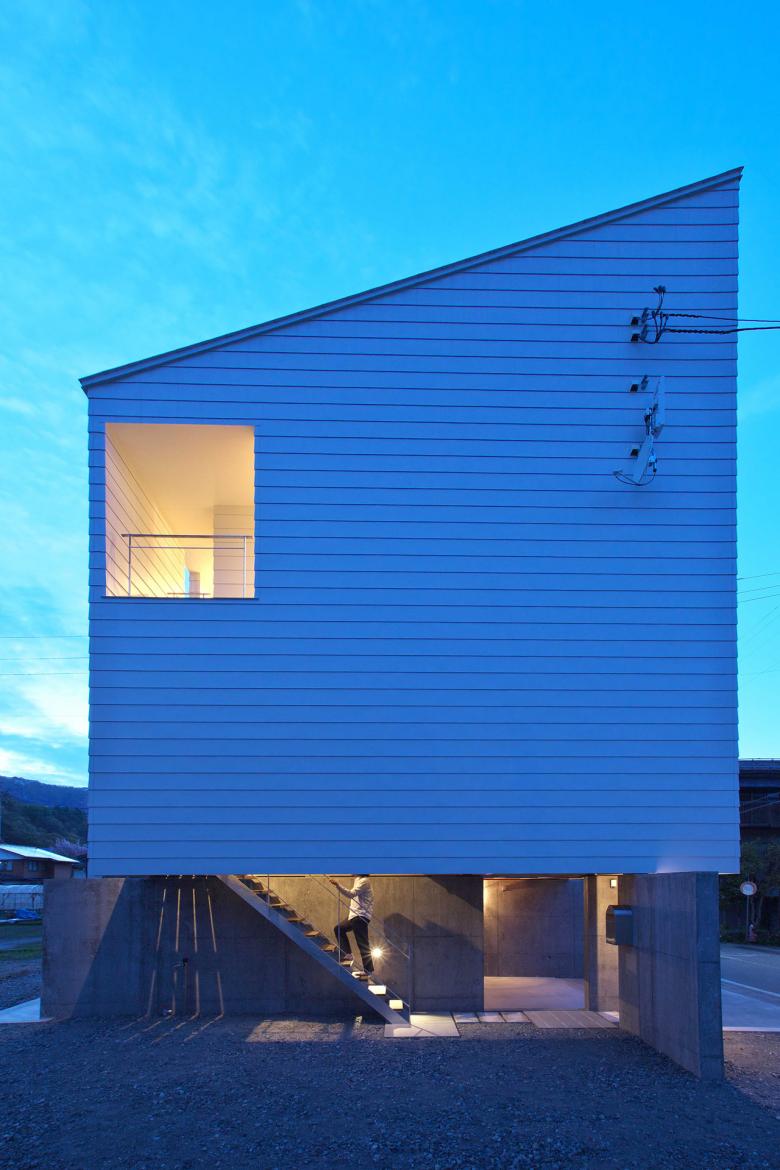 敷地周辺の住宅の建ち方に習い高床式住居とし、生活スペースを地上から上空に持ち上げた。クライアント夫妻の希望するライフスタイルや屋外との関係の作り方といった、