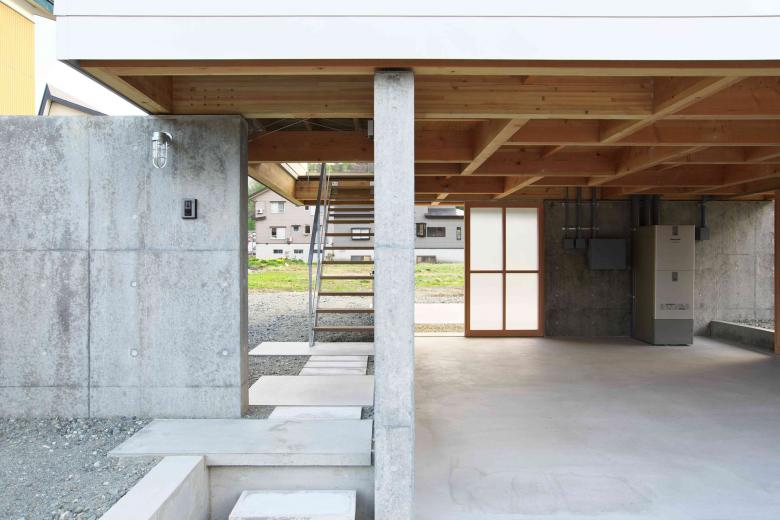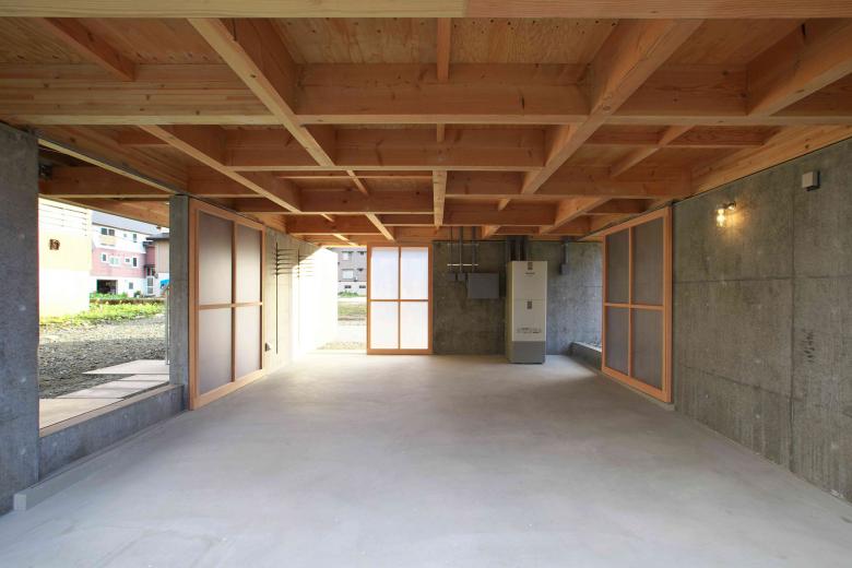 地上階にせっかく生まれた高床下空間を、コンクリートで囲まれた光の届かない埃や排気ガスにまみれたガレージ空間としてしまうことに違和感を感じ、