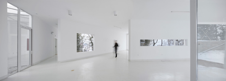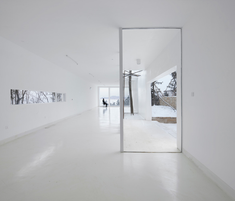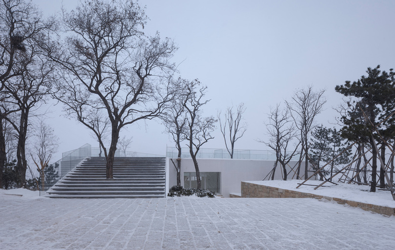 To protect the trees in site and offer the view to major sights of city, the building is conceived as a merged volume with three viewing tubes like tree branches orientating to different axis. Half buried and half cantilevered, the building provides to the visitor different experience on two levels: walking down half level, one will enter the inside of teahouse and gallery space with framed views to various scenery; walking up through the preserved trees in landscape to the roof terrace, one will enjoy a unfolded breathtaking panoramic view to the ocean on this viewing platform.