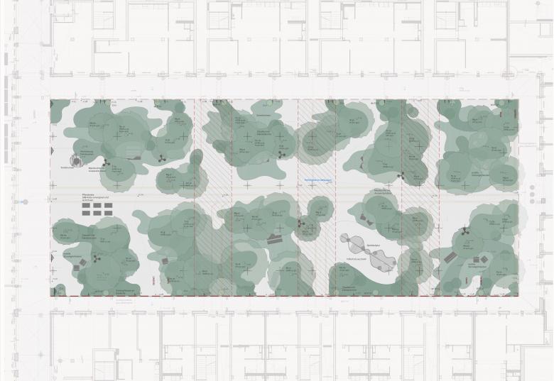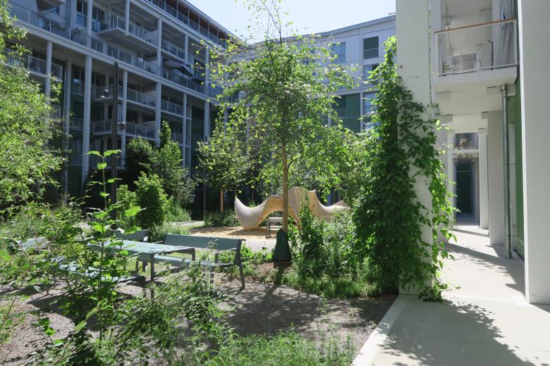 Der Innenhof bildet eine grüne Oase im dichten Stadtgefüge - die Vielfalt der Flächen
