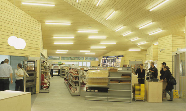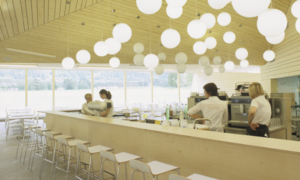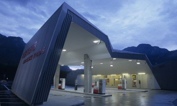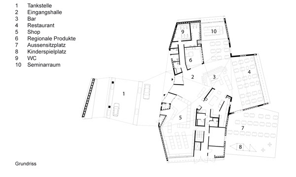 Die Aktiengesellschaft Viamala Raststätte Thusis AG stellte im Jahr 2005 die Aufgabe, an der A13 Ausfahrt Thusis Nord eine Raststätte mit rund 200 Sitzplätzen, 110 m2 Shop, Tankstelle und rund 130 Parkplätzen zu erstellen. Der Entwurf setzte sich mit dem Thema “Raststätte als Fenster zur Region” auseinander. Zentraler Aspekt waren die strukturelle Grundrissgliederung mit zentraler Eingangshalle und die in die Landschaft ausgreifenden Arme. Diese sollten den Kontakt zur Landschaft herstellen, die Jahreszeiten erlebbar machen und spezifische landschaftliche Bilder für den Innenraum rahmen. Von den Parkplätzen auf das Raststättengebäude zugehend, thematisiert das expressiv ausgeformte Tankstellendach den Eingang zur Raststätte. Durch präzise Verdrehungen des Grundrisses konnte zudem ein Nebeneinander von Tankstelle und Eingangszone geschaffen werden. Im Innern des Gebäudes liegt zentral die Bar als Drehpunkt des Gebäudes. Von hier aus erhält der Gast die beste Übersicht über das Angebot der Raststätte. Zwei Arme führen in den Restaurantbereich mit Ausblick ins Domleschg sowie in Schin- und Viamalaschlucht. Ein weiterer Arm führt über den Shop zum Ausgang der Raststätte mit Kassabereich.