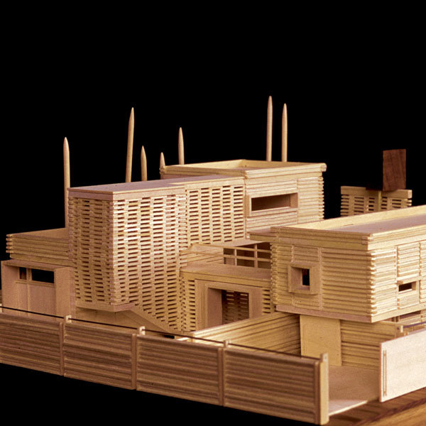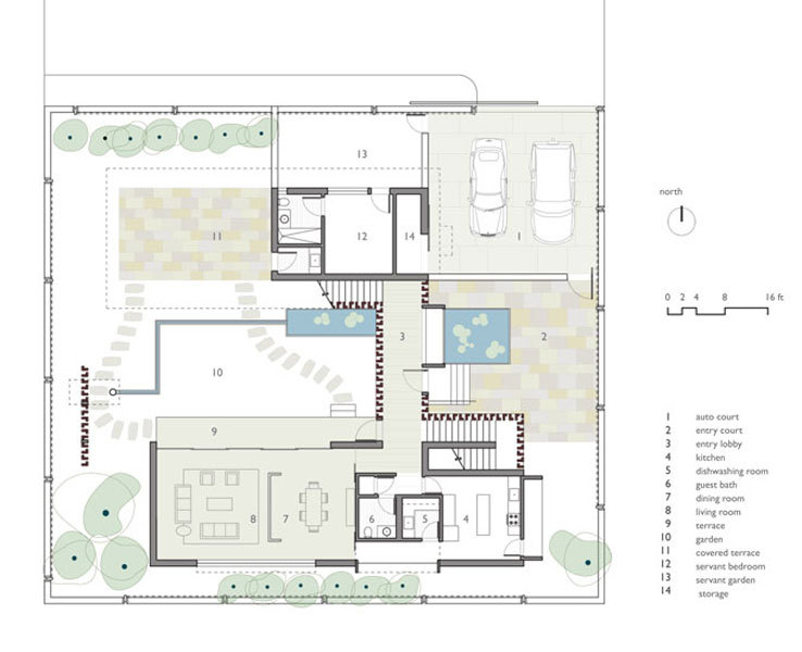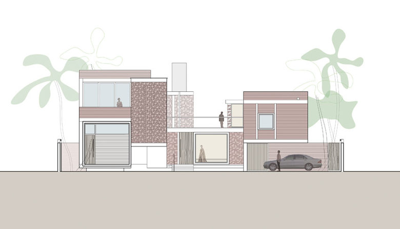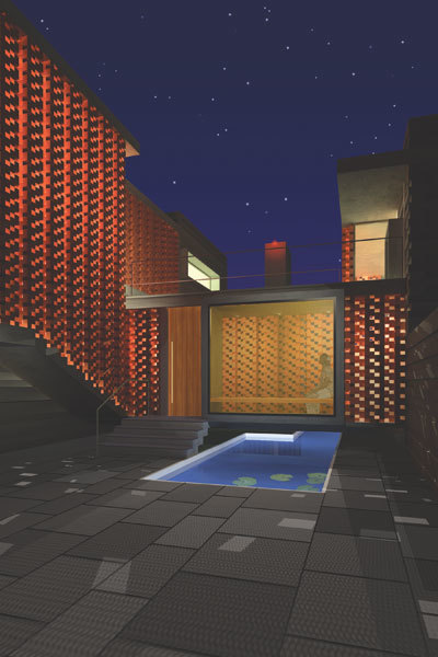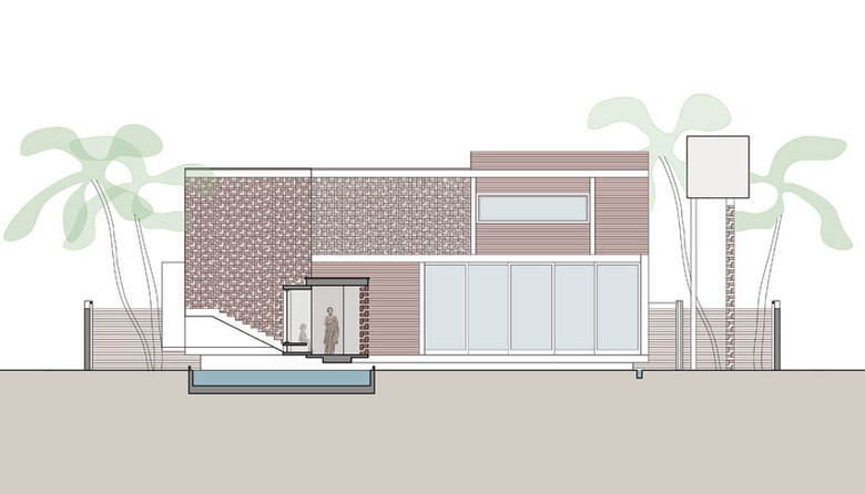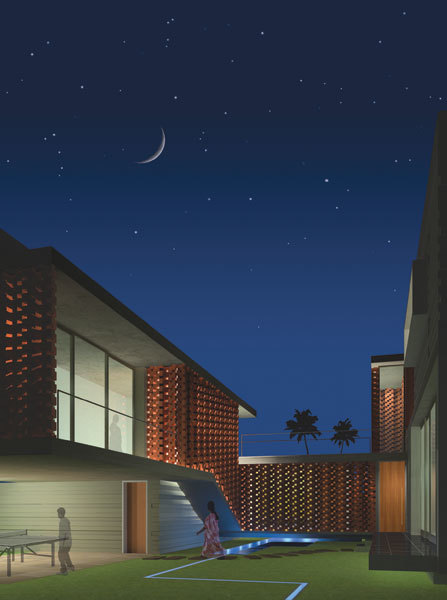 This residence has been designed for three generations of a South Indian family. Linked by a water channel, a sequence of courtyards and gardens weave through the primary volumes of the building. The circulation galleries and stairs are enclosed in permeable brick walls, filtering light and breeze in the tropical climate. Recycled concrete utility poles are stacked to mark boundary walls. The high humidity will ensure a fine growth of moss on the slightly offset concrete surfaces – a result of the irregular sizes of poles. The roof terraces and balconies are covered in salvaged porcelain tile, offering a reflective foil for the tropical sun. The erratic municipal water supply in Chennai necessitates a large water storage tank, typically situated on the roof. Inspired by the clients’ fascination for shadow patterns, the water tank has been mounted atop the western screen wall, creating a sundial in the main garden.