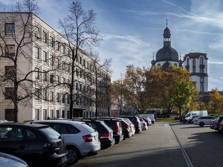 Die Form des Baukörpers leitet sich aus der Wiederherstellung der für die Stadt prägnanten Blockstruktur ab. So entsteht auch die Ergänzung und Komplettierung des Stadtprospektes von Süden im Zusammenhang mit dem Schloss, der Jesuitenkirche und der Sternwarte. Besonders die architektonische Haltung der Fassade spielt hier eine wichtige Rolle: Die Südostecke von B6 besitzt eine betont ruhige und geschlossene Wirkung. Der Haupteingang des Neubaus liegt zwar an der Straße, ist jedoch als Durchgang zum Blockinneren ausgebildet, so dass auch von dort ein gleichwertiger Zugang entsteht.