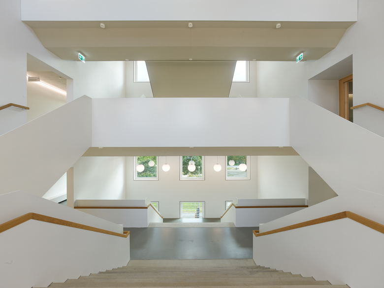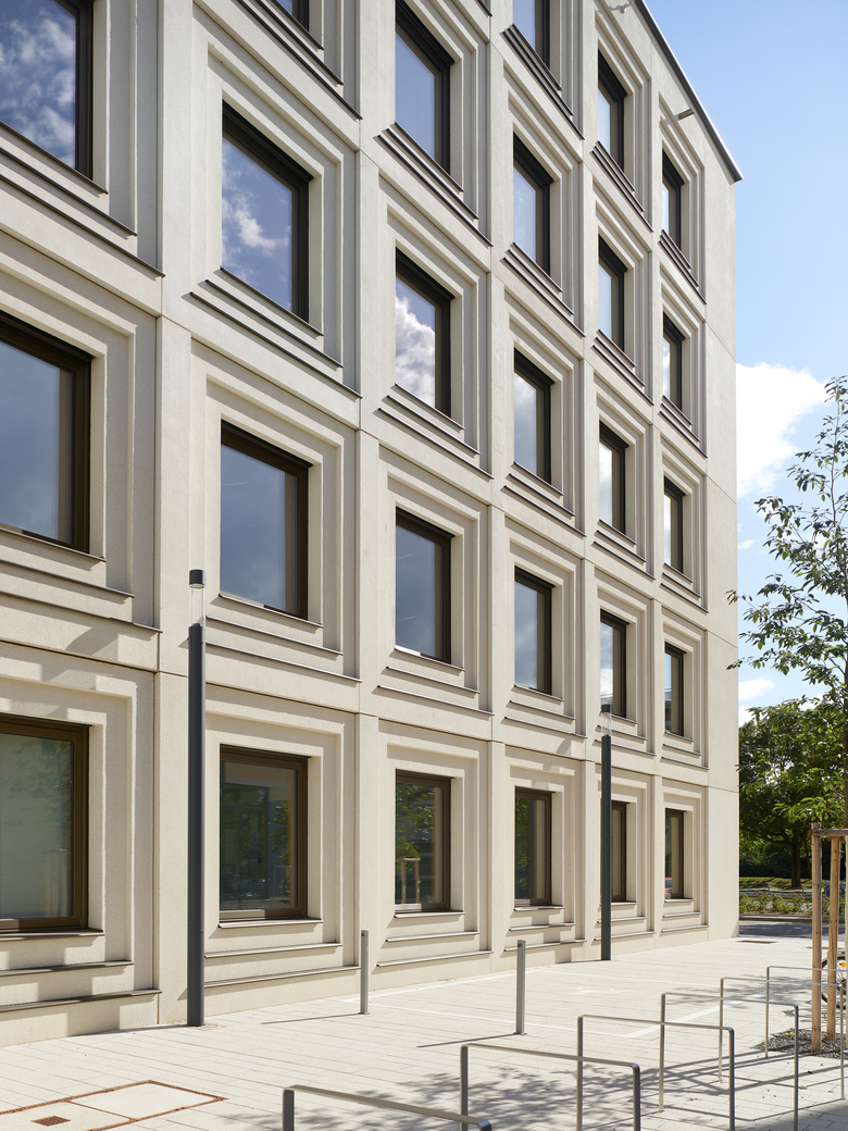 Die Besonderheit dieses Projekts liegt in der Weiterentwicklung des vertrauten Blockrands: Aus der Typologie eines Hochschulbaus mit mehreren Seminar- und Büroräumen unterschiedlicher Tiefe ist ein Gebäude entstanden, das zwar als Blockrand lesbar bleibt, gleichzeitig durch die Einstülpungen in die Baufelder eine klare räumliche Gliederung des Blockinneren erreicht. So treten das Außen und das Innen des Blockrands in einen neuen Zusammenhang.