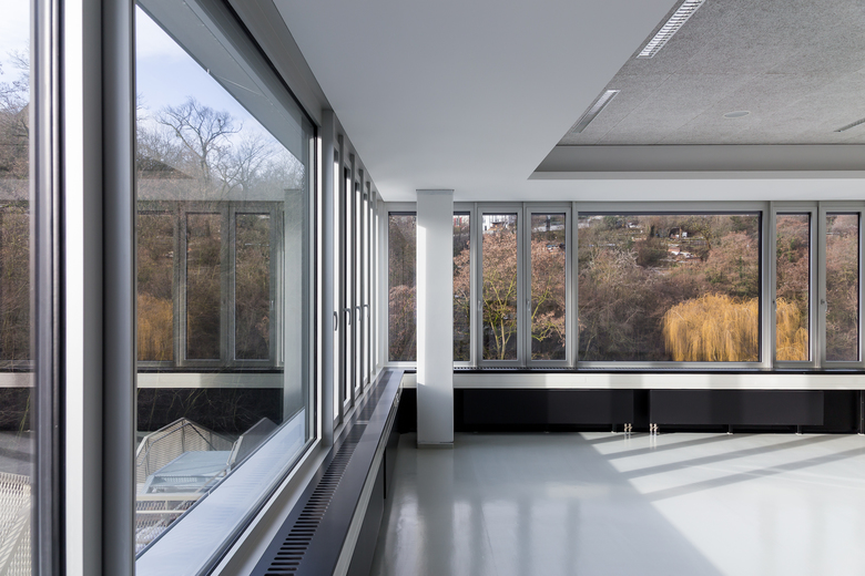 Die Kubatur des vorhandenen Gebäudes wurde nur unwesentlich verändert. Auch die Erschließungen konnten weitestgehend beibehalten werden. Das Schulzentrum wird vor allem über seine klare horizontale Gliederung inmitten einer natürlichen Geländemulde wahrgenommen. Diese Charakteristik wurde gestärkt: Die zurückgesetzten verglasten Flächen mit schwarzen Profilen und die Deckenrandbekleidungen aus gelochten Aluminiumplatten betonen die Schichtung der Geschossebenen und die Horizontalität der Fassaden.