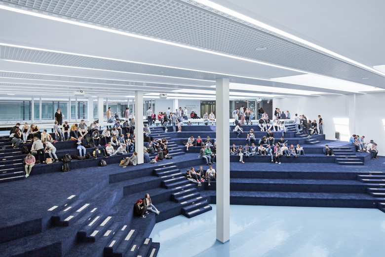 Die Atmosphäre der Innenräume wird vor allem durch die gezielt eingesetzten Farben, das Tageslicht und die grafischen Akzente des Leitsystems geprägt, weniger von einer bestimmten Materialität. Dadurch werden die neu geschaffene Offenheit, Helligkeit und Leichtigkeit der Schule spürbar.