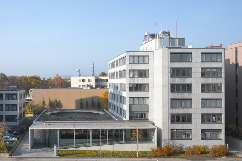 Um auf diese Situation zu antworten, wurde neben das vorhandene Gebäude der GFT ein autonomer, eingeschossiger Baukörper gesetzt, der sich funktional an den Bestand anfügt. Die Position des Neubaus definiert bewusst einen hinteren, in Richtung Westen orientierten, introvertierten Außenraum. Die Erweiterung bindet das Gebäude vorne an die Schelmenwasenstraße an, wo eine Rampe adressbildend den neuen Haupteingang definiert.