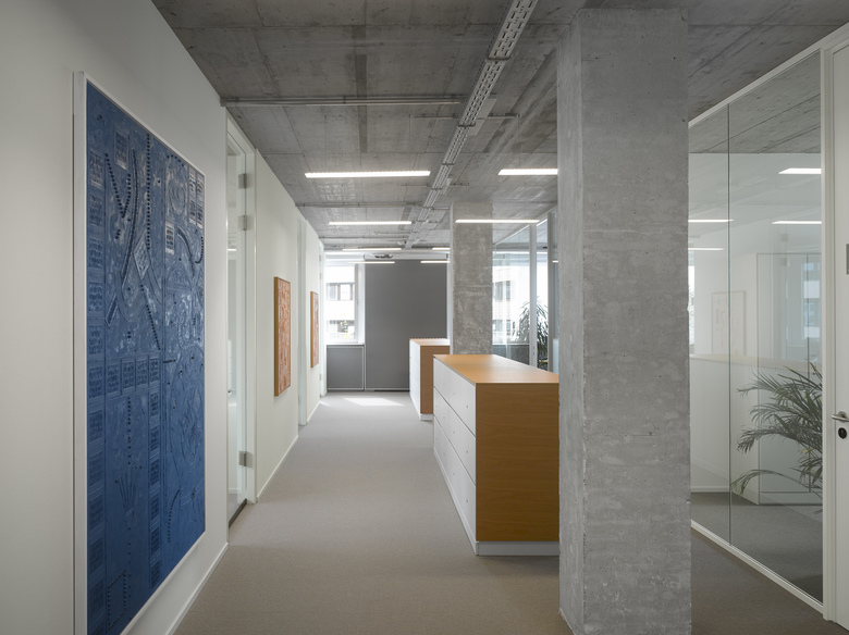In den oberen Geschossen des Altbaus wurden die Büros in einfacher Weise neu strukturiert: Transparenz und freundliche, helle Materialien verleihen den alten Büros ein neues, atmosphärisches Aussehen. Eine Besonderheit bildet das erste Obergeschoss, das für das junge Firmensegment CODE N mit einfachen, von einem Künstler entwickelten Papptrennwänden gestaltet wurde.