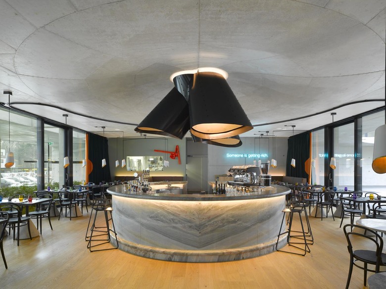 Im angrenzenden Neubau ist das Restaurant mit der kleinen Küche und zentraler Theke untergebracht – durch verschiebbare Elemente wird hier ein gemeinsamer und zusammenschaltbarer Bereich für Veranstaltungen und Kunstevents geschaffen.
