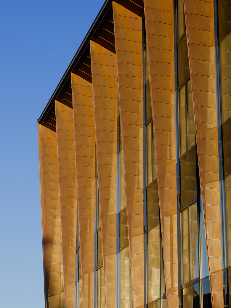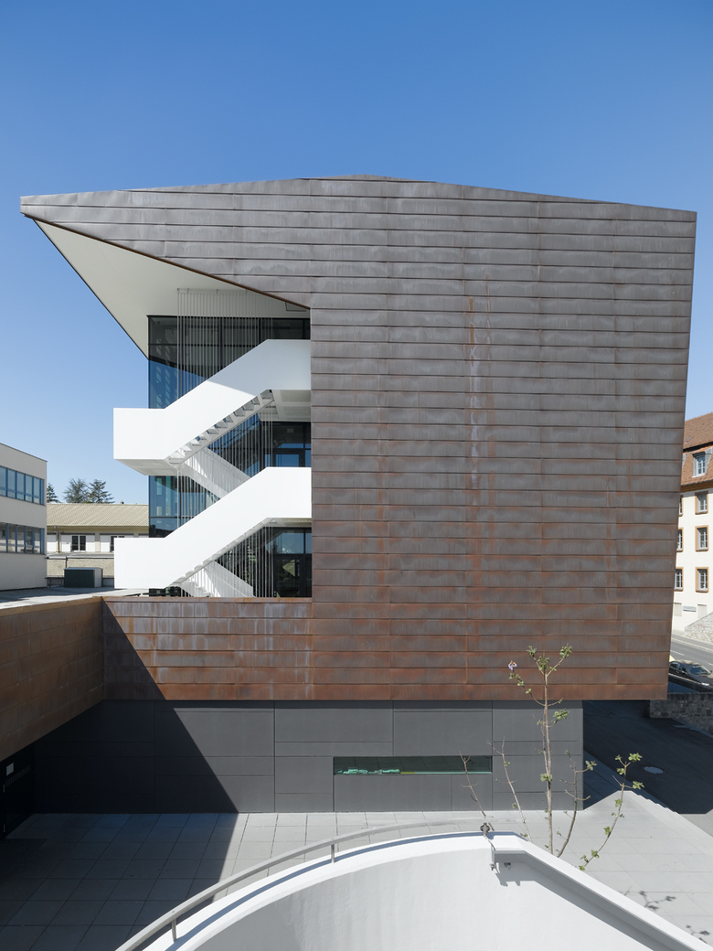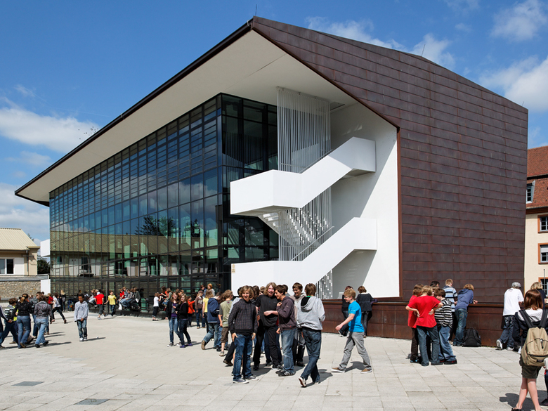 Mit dem Erweiterungsbau des Gymnasiums von 1975 konnte der Straßenraum wieder gefasst und ein Auftakt für die barocke Würzburger Altstadt markiert werden. Die Form des Baukörpers nimmt geometrische Bezüge zur Nachbarbebauung auf. In örtlicher Bautradition findet Kupfer, neu interpretiert, seinen zeitgemäßen Einsatz und wird zum stilbildenden Element. Der Neubau wendet sich mit einer offenen Geste zum Altbau, so dass der zentrale Pausenhof zu einem feiräumlichen Bindeglied wird. Die verglaste Treppenhalle bringt Licht bis in das Erdgeschoss. Durch die einhüftige Orientierung entstehen helle Erschließungsbereiche mit Ausblicken zur Stadt und zur Marienburg.