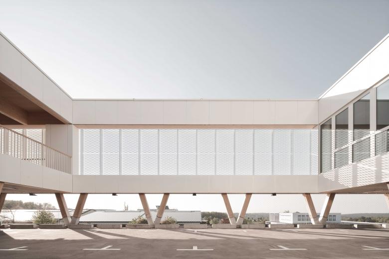 Die Trennung und Stapelung der einzelnen Funktionsebenen sowie die Nutzung der Hanglage des Grundstücks gehören zum wesentlichen Entwurfskonzept. Dadurch konnte die versiegelte Grundfläche minimiert werden, zudem bettet sich der Baukörper harmonisch in die Topografie ein. Der in den Hang eingefügte massive Sockel öffnet sich nach Norden zur Straße. Darin befinden sich die Halle für die Löschfahrzeuge, alle für den Einsatz notwendigen Funktionen sowie Lager- und Technikflächen. Das offene Zwischengeschoss verfügt über zwei Lichthöfe und nimmt die umgebende Landschaft auf. Es ist über eine außenliegende Rampe erreichbar und dient als Parkierungsebene und Übungsfläche für Ausbildungszwecke. In dem darüber aufgeständerten Holzbaukörper sind ein Schulungsraum, Büroflächen und weitere Gemeinschaftsräume angeordnet. Dieser wird von einer homogenen weißen Streckmetallfassade umhüllt. Nach außen hin ist die Stapelung der unterschiedlichen Nutzungsbereiche klar erkennbar, was ein charakteristisches und identitätsstiftendes Erscheinungsbild erzeugt.