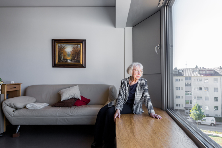 Das X-förmig gestaltete Pflegeheim korrespondiert mit den Raumfluchten der versetzt angeordneten Nebenstraßen, die direkt auf das Grundstück zulaufen. Dadurch entsteht eine prägnante räumliche Fassung, die einen geschützten Eingangs- und Gartenhof ausbildet. Der Mehrwert für die Bewohnerzimmer entsteht durch die aufgeklappten Erker: Diese bieten nicht nur mehr nutzbare Fläche, sie stärken zudem die räumlich-atmosphärische Wirkung im Innern und treten nach außen plastisch aus der Fassade.