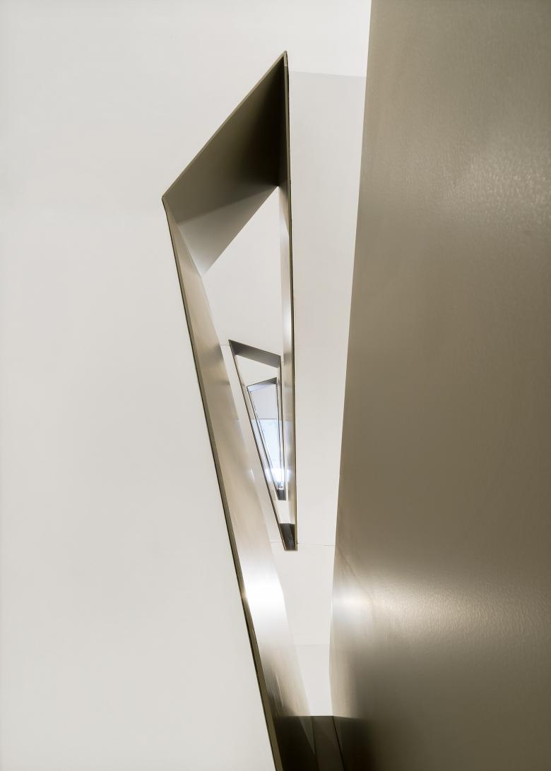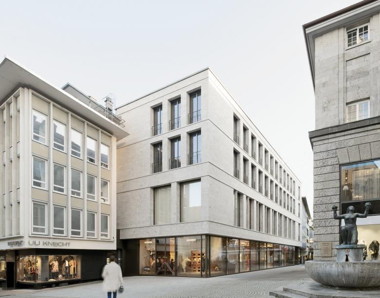 Mit der Fassade aus Mooser Muschelkalk wurde ein typisches Material aus der Region übernommen. Ein grober Kratzschliff verleiht dem Stein einen helleren Farbton, so ist er deutlich als Naturstein zu identifizieren. Die Fassade des Neubaus ist plastisch ausgebildet und fein strukturiert, um die charakteristische Architektursprache der Fünfzigerjahre aufzunehmen. Das von Karl Gonser 1956 fertiggestellte Gebäude »König von England«, das sich in räumlicher Nähe befindet, ist ebenfalls eine wichtige Referenz. Zugleich zeigt sich der Neubau als klar gestalteter Kubus, der deutlich in der zeitgenössischen Architektur verortet ist.