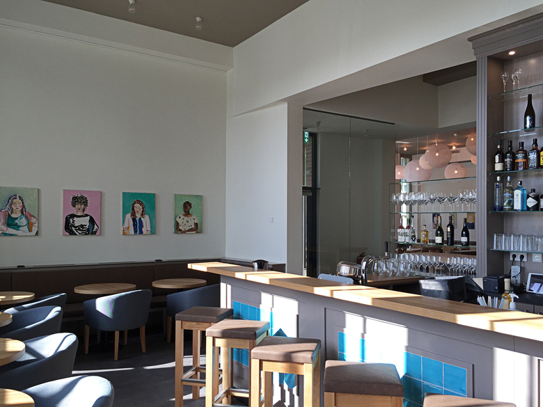 Entree/Windfang/Bar | Die Erschließung des Gebäudes erfolgte, wie in seiner ursprünglichen Konzeption weiterhin über den Haupteingang, durch den mittig akzentuierten Baukörper auf der Nord-/Ostseite. Im Foyerbereich wurde eine neue Bar geschaffen, welche zugleich als Empfangstresen für den Gast genutzt wird. Die daran angrenzenden Räume werden als Gasträume genutzt.