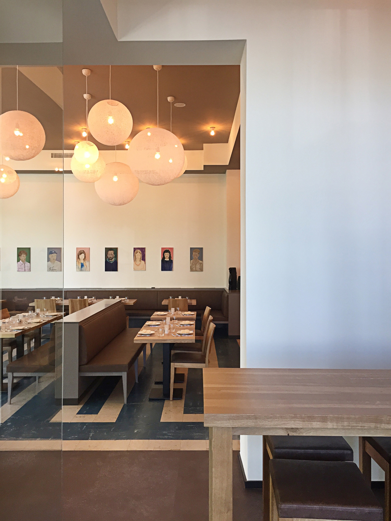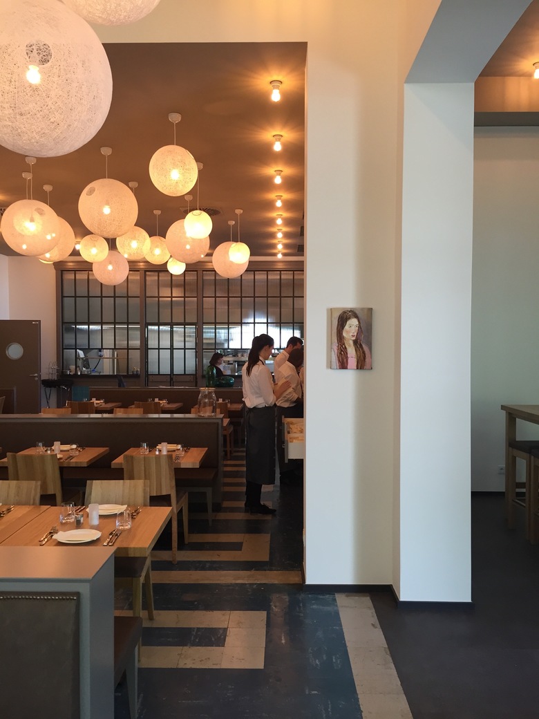Versetzen der Küche I Beleben der Schaufassade (Nord-Ost) | Die ehemalige Küche wurde in den hinteren Restaurantbereich (Querriegel hinter Empfang, rechte Seite) verlegt. Durch die zentrale Lage im Gebäude können die Küchenabläufe hierdurch optimiert werden. Des Weiteren wird durch die Umnutzung der ehemaligen Küche zu einem Gastraum ein qualitativ hochwertiger Raum mit direktem Tageslicht und leicht separierter Lage geschaffen. Hierdurch wird das Gebäude auch von aussen für vorbeilaufende Passanten belebt, da diese von Aussen einen Blick in das Gebäudeinnere werfen können.