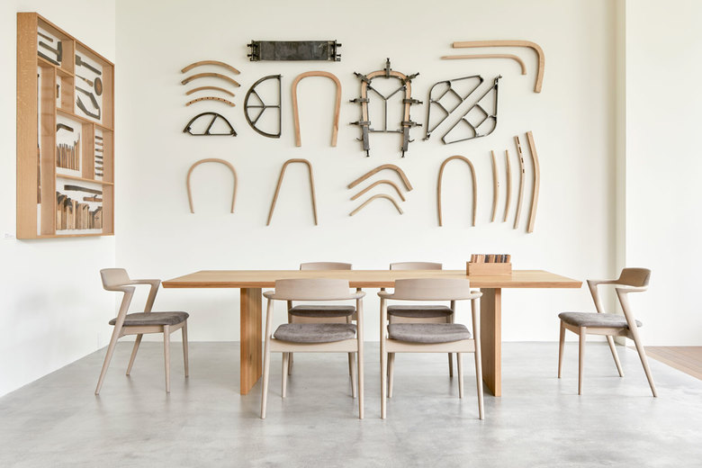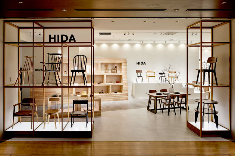 A store where you can experience Hida Takayama furniture. Hida Sangyo, the company that operates the shop, is a woodworking furniture manufacturer that continues to develop cedar, which was once considered unsuitable for furniture, into furniture. To make their skills felt everywhere, the facade is made of 50% compressed cedar wood, and craftsmen’s tools are displayed on the wall to visualize their skills and to increase the affinity between the users and the manufacturer.