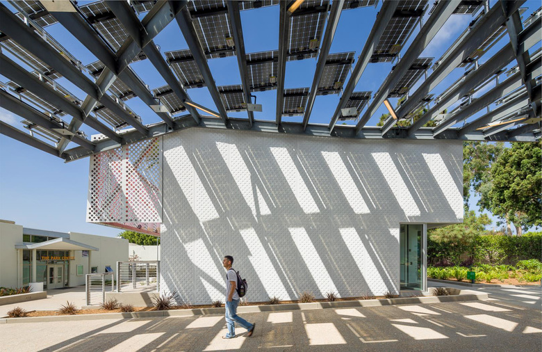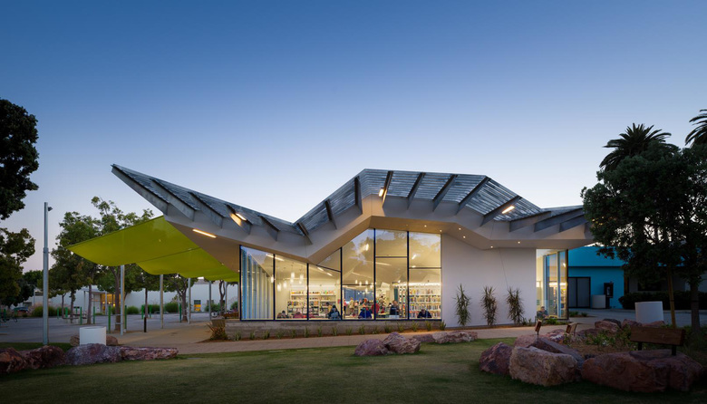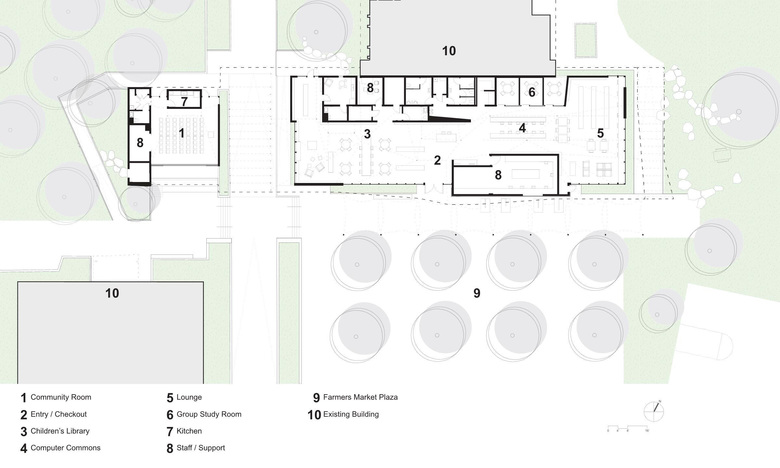 Located in the center of Virginia Avenue Park, the library is surrounded by low income apartment residents to the north and single family households to the south. The interactive design process quickly revealed the community desire to maintain all green space and favored locating the library at the edge of the Saturday Farmer’s Market Plaza. The active face of the library replaces the blank face of an existing building and bumps into the market with a resonance that energized the community, and around which, librarians developed programs about food and health. Constrained to the east by the playing field the building jumps the fire lane to the west to include a needed community room. The move, initiated by necessity, leverages opportunities: the community room and small amphitheater forge a link to the Park Center while the photovoltaic canopy that spans the fire lane enhances the pedestrian quality of this important north/south path that connects indoor programs and neighborhoods.