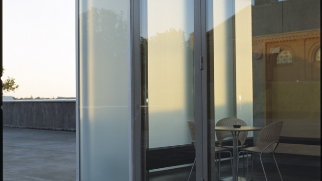 Cafeens sydvendte facade kan åbnes om sommeren, hvor der vil være udeservering i læ fra de eksisterende bygninger. Terrassen indgår i det samlede forløb af pladsrum, ned over Mogenstrup ås, som udgøres af Kvægtorvet, arealet nord for Ny Ridehus og Højeplads. Byterrassen bliver dermed bindeled mellem de omgivende aktiviteter med direkte adgang til Ny Ridehus, Grønnegades teater og den nye foyerbygning. Den nye foyerbygning er udført in-situ støbt beton, Mellemgange og toiletter er apteret med industrilakeret MDF plader. Salen i Ny Ridehus er på vægge og loft beklædt med brandimprægnerede rødbejdsede fyrtræslister. Næstved Kulturhus blev som det eneste danske projekt indstillet til finalen om den europæiske arkitekturpris Mies van der Rohe Award 2003.