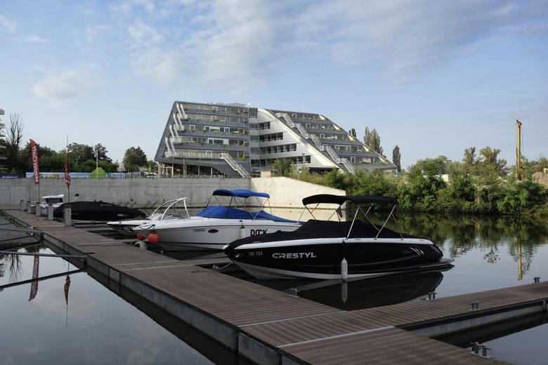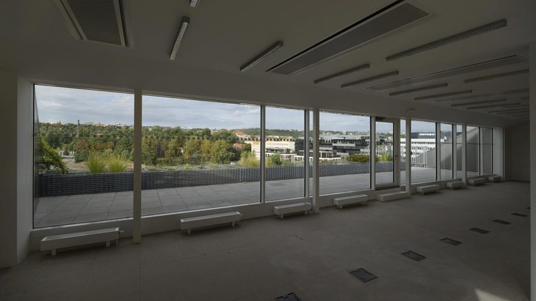 Thanks to its cascading shape each floor offers terraces and views towards the marina placed into the bay of the Vltava river. the building offers office and commercial space in a total of 6 receding floors and two underground car park levels for the tenant's employees. The building was designed to meet sustainable environmental standards - certified as LEED Gold.