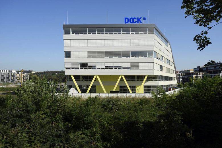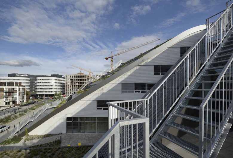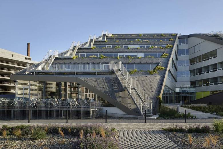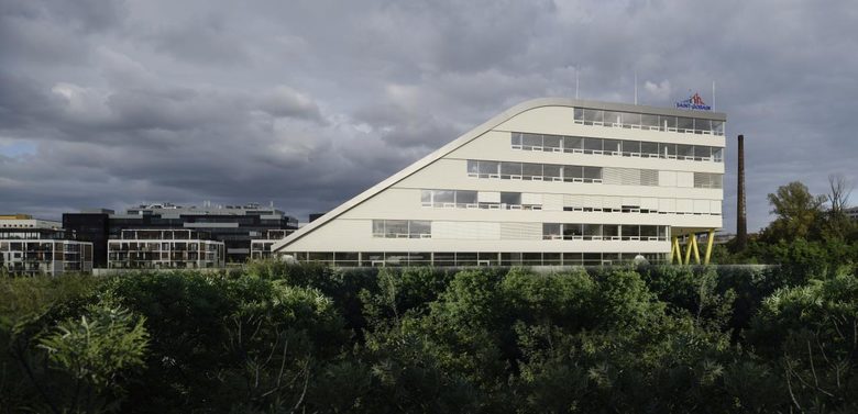 The V-shaped office building protected by a sloped green roof with terraces towards the riverfront is part of the emerging Prague DOCK office park designed by Schindler Seko architects.