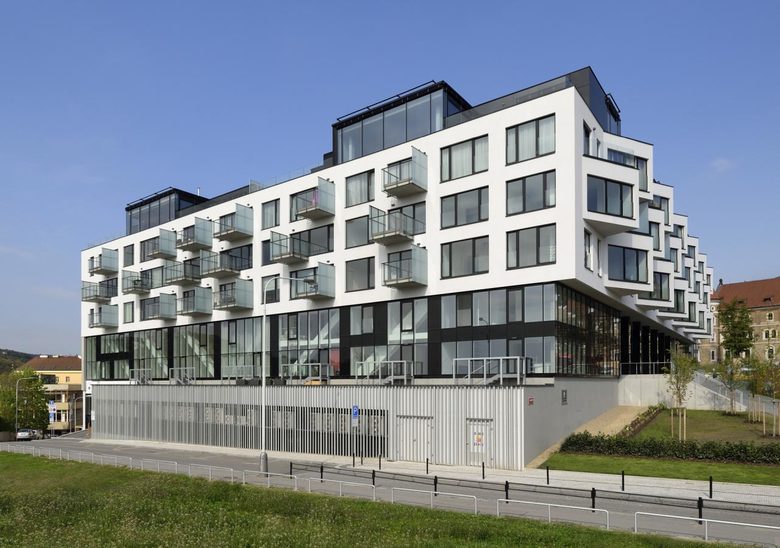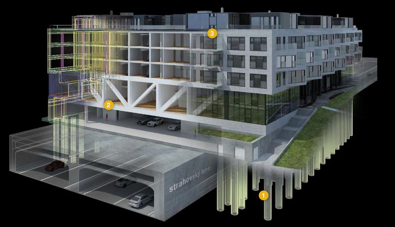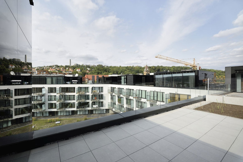 In this second phase we are creating a housing project of 85 apartments which are literally nesting inside a bridge and may resemble the Florentine Ponte Vecchio - in our case the residences are bridging the invisible obstacle of the underground car tunnel. Our plot is surrounded by great neighbors - Sacre Coeur Park, the Monastery of St. Gabriel and the Kinsky Garden, while hovering above the tunnel with panoramic views to Prague.