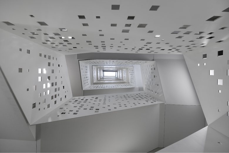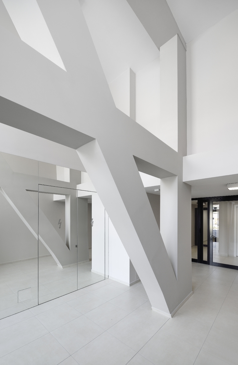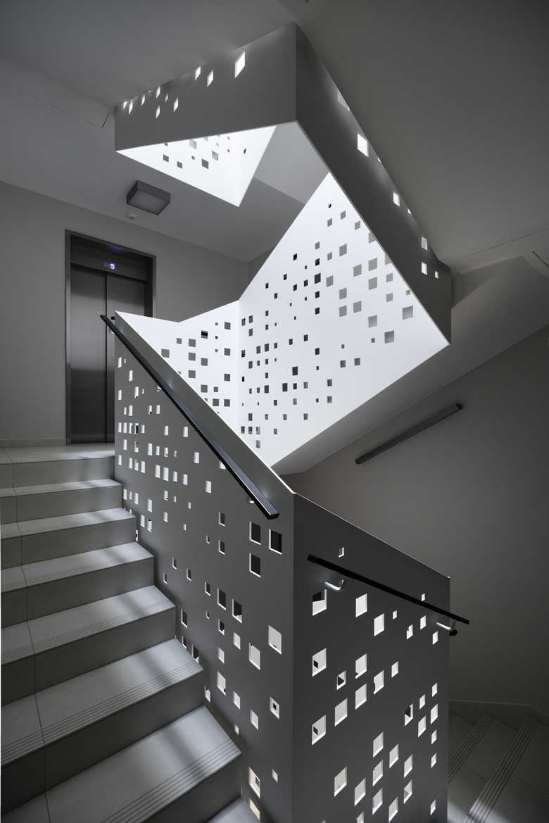 Parking and cellars are located under the entire building being the only structure resting on the descending tunnel. The garage space cascades along the given slope and creates terraces for car lots.
