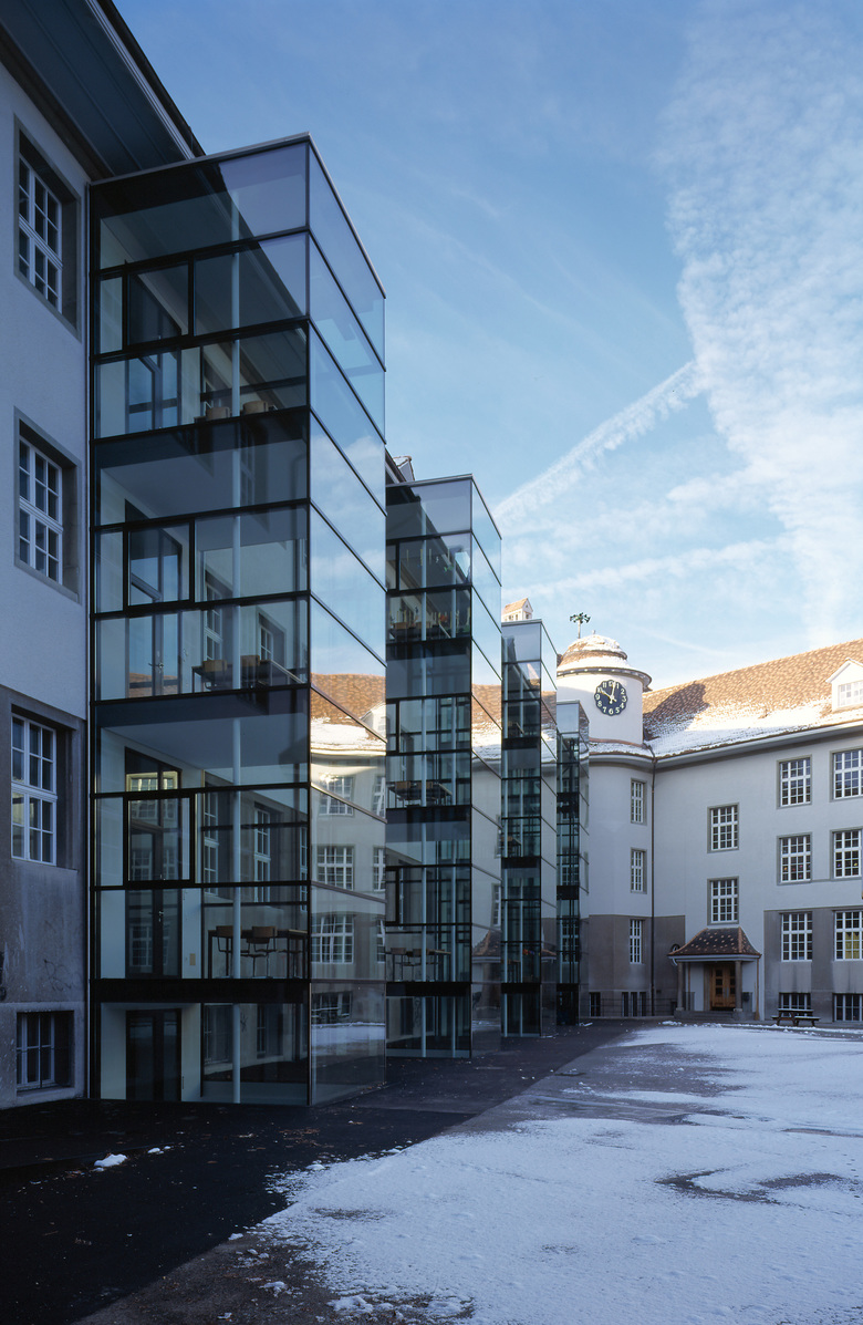 Mit neuen Fassadenanbauten werden die Bedürfnisse nach zusätzlichen Gruppenräumen, helleren Korridoren und einem Aufzug erfüllt und gleichzeitig wird die kasernenartige Fassade in eine neue Massstäblichkeit überführt.