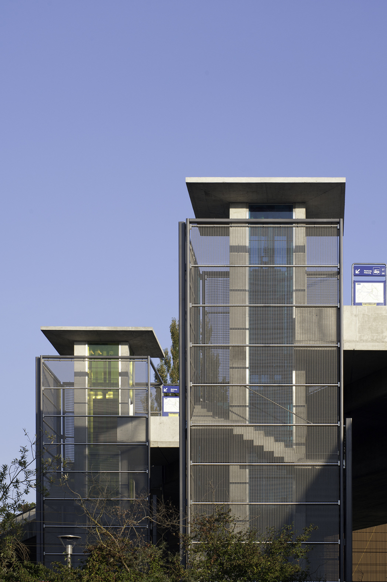 Die „fliessenden“ Bänder in der Landschaft – Bahn, Autobahn - kreuzen sich in Niederwangen mit der zwar uferverbindenden aber ebenfalls verkehrsdominierten Riedmoosbrücke. Genau an der Kreuzungsstelle werden sie mit drei vertikalen, punktförmigen Bauobjekten miteinander verknüpft. Im Wechselspiel von Sonnenstand, Wetter und Tageszeit, verändern die Türme kontinuierlich ihr Erscheinungsbild. Die von innen beleuchteten farbigen Lifttürme wirken nachts als Leuchtstoffröhre, tags über wechselt sich Durchsicht und glänzendes Strahlen ab. Darin bewegt sich die ebenfalls in farbigem Glas gehaltene Liftkabine.