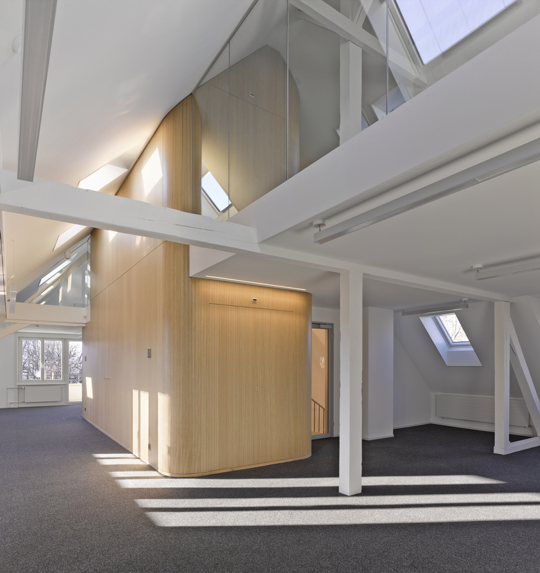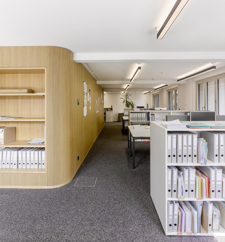Mit dem Umbau konnten die Grundrisse befreit und neuorganisiert werden. Um eine durch sämtliche Geschosse verlaufende Kernzone, mit Nebenräumen, entstanden der Fassade entlang grosszügige, fliessende Räume. Ein übergeordnetes Farbkonzept sorgt für ein zeitgemässes Ambiente und für das Miteinander der denkmalgeschützten Substanz und des Neuen. Der Kern wird identitätsstiftend und schallabsorbierend in Eiche materialisiert. Während die Arbeitsplätze und Sitzungsbereiche auf einer dunklen Teppichfläche ruhen, sind die öffentlicheren Bereiche wie Empfang, Lounge und Cafeteria auf einer hellen Fläche aus Terrazzo organisiert. Helle Wandflächen und gezielte farbige Akzente sorgen für ein zeitgemässes Arbeitsumfeld. Die Haustechnik wird auf den neusten Stand gebracht und mit einer Photovoltaikanlage ergänzt. Die gewählte Baustellenorganisation sorgt für eine konzentrierte Umbauphase und verkürzt die Zeit im Provisorium.