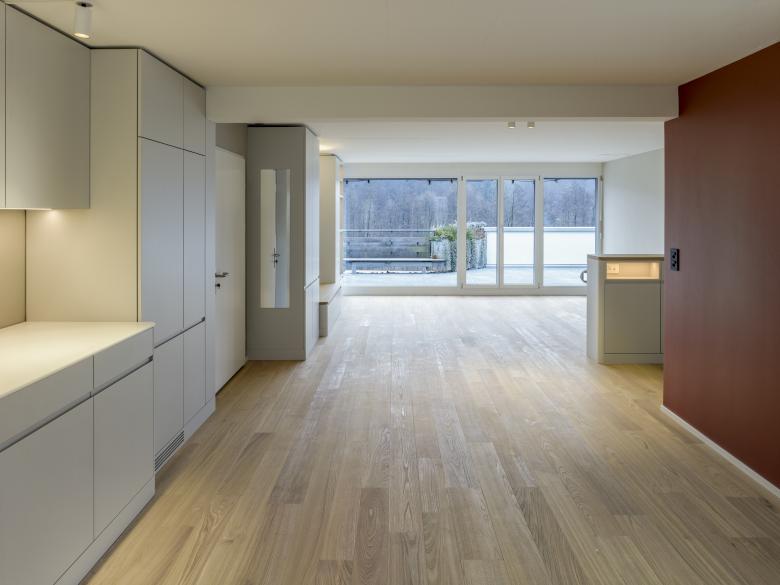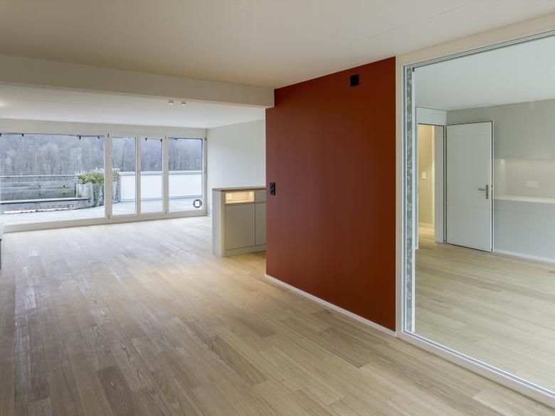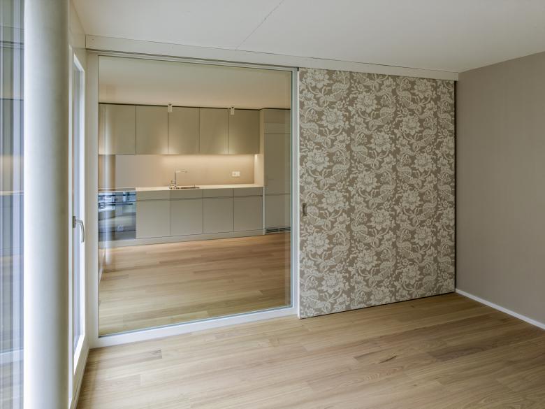 Zusätzlich öffnet eine grosse Festverglasung zwischen Küche und Zimmer den Blick auf die nördlich gelegene Terrasse. Mit einer tapezierten Schiebetüre kann jedoch auf Wunsch trotzdem die nötige Privatsphäre hergestellt werden.