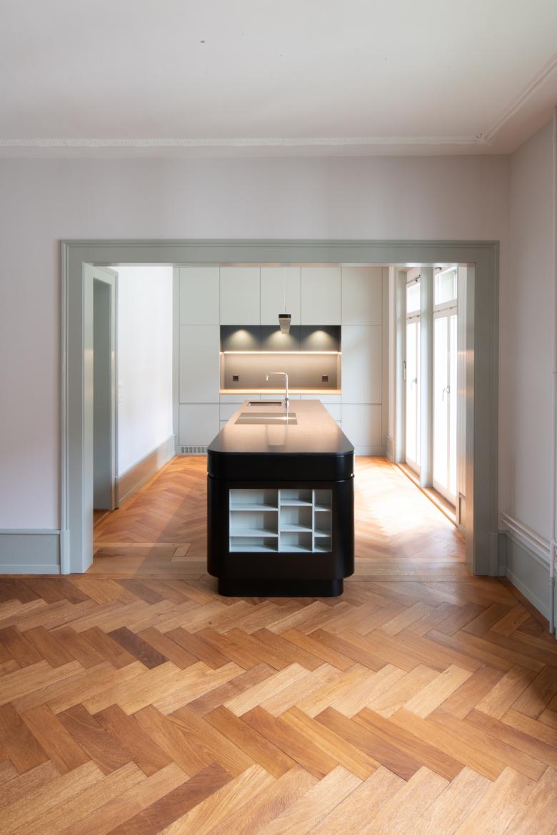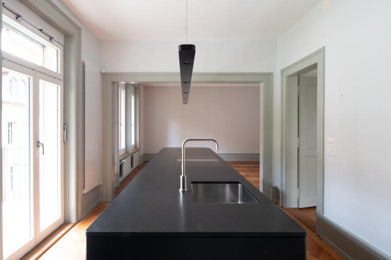 Durch die Neuanordnung der Küche, der Nasszonen sowie der Schaffung eines grosszügigen Garderobenteils konnte die Wohnung respekt- und qualitätsvoll erneuert werden. Die südseitig neuen und grosszügigen Balkone sowie das an den originalen Farbtönen anlehnende stimmige Farbkonzept trägt zum Wohlbefinden in den neu gestalteten Räumlickeiten bei.
