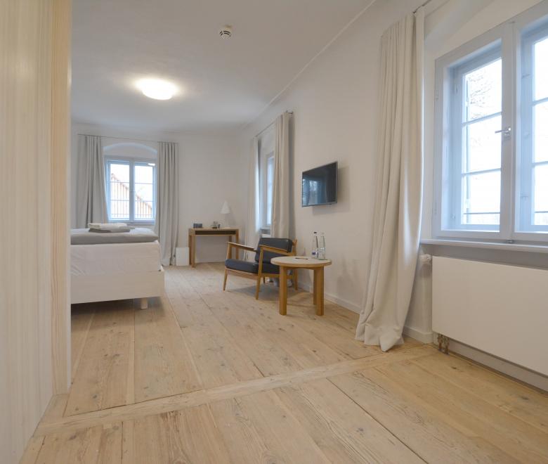 Die neuen Hotelzimmer im OG sind durch die restaurierten Dielenböden geprägt.