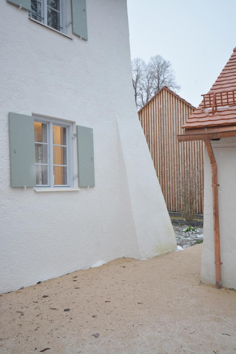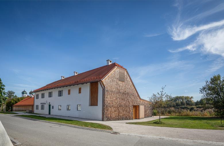 strukturierten Sparren und die zum See orientierte Holz-Glasfassade geprägt und setzt sich damit von dem historischen Gebäude ab. Gleichzeitig wird mit der gewählten Materialität auf die regionale Besonderheit der landwirtschaftlich geprägten Strukturen verwiesen. Der westliche Giebel und die Fassaden der neuen Bauteile sind mit Lärchenschindeln verkleidet. Sie stärken das Ensembles mit den ebenfalls verschindelten Giebelfasaden der benachbarten Gebäude.