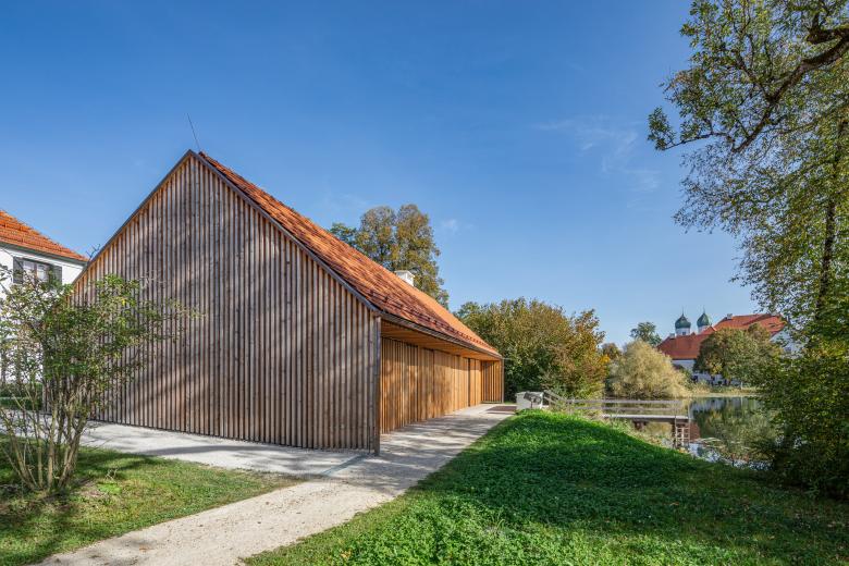 Nach Abbruch der Zu- und Anbauten wurde zum See hin ein hölzerner Ausstellungraum ergänzt., der in Verbindung mit dem neuen Klosterladen das kulturelle Angebot von Kloster Seeon abrundet.