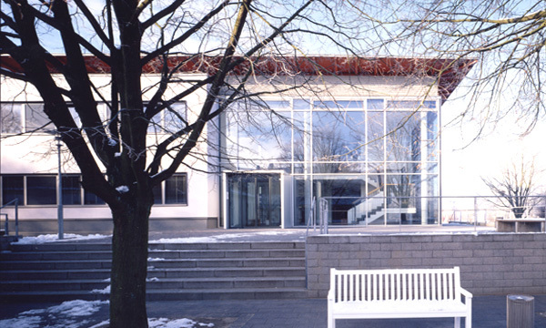 Die Anschlüsse zum Altbau werden durch Glasfassaden hergestellt. Das Technikgeschoss ist mit Aluminiumwellblech verkleidet. Der Haupteingang ist durch ein natursteinverkleidetes Treppenhaus in Achse der Allee markiert.