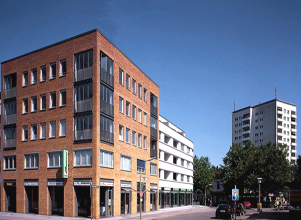 Das überbaute Eckgrundstück wurde mit einem markanten fünfgeschossigen gelb verblendeten Wohn- und Geschäftshaus bebaut, an das ein - dem gekurvten Straßenverlauf folgend - viergeschossiger, weiß verputzter Gebäudeteil angefügt wurde. Hieran schließt ein weiterer rot-gelb verklinkerter Wohnungsbau an.