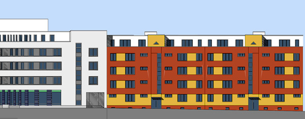 Die Vorgaben des Bebauungsplanes zielten auf eine Blockrandbebauung ab. Unter Einbeziehung des bestehenden Wohnhochhauses und der Läden am Ort soll in Zukunft ein Platzraum entstehen, der dem wöchentlichen Marktgeschehen ein attraktives Ambiente bietet.