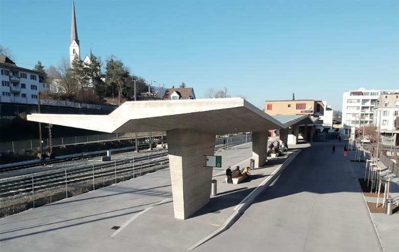 Die grosszügige und repräsentative Gestaltung des Bushofplatzes ermöglicht eine angenehme Koexistenz der vielfältigen Nutzungsansprüche von Bewegung und Aufenthalt durch Fussgänger, Velos und Busse. Ein einheitlicher Belag, Baumgruppen und das eigenständige Dach der Bushaltestelle prägen den neuen Platzraum. Mit seiner gefalteten Dachform strukturiert und positioniert es den Ort. Die Bretterschalung der Betonoberfläche folgt der Geometrie und unterstützt die Faltung – die ‹Wellen›.