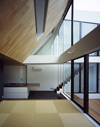 都心の閑静な住宅地にある旗竿敷地。アプローチから感じる閉鎖的なイメージとは対照的に、大きな中庭を中心とした開放的な内部空間は、外界を遮断しながら独特の小宇宙をつくりあげている。夫婦でハンモックに揺られ、バーベキューをしながらワインを楽しむためダイニングやオリジナルキッチンも充実。開放的なコートとは対照的に、一人になれる瞑想空間や書斎も完備。まさに都市生活者のための極上リゾートのような隠れ家である。