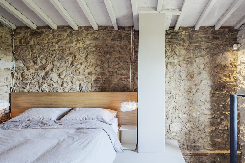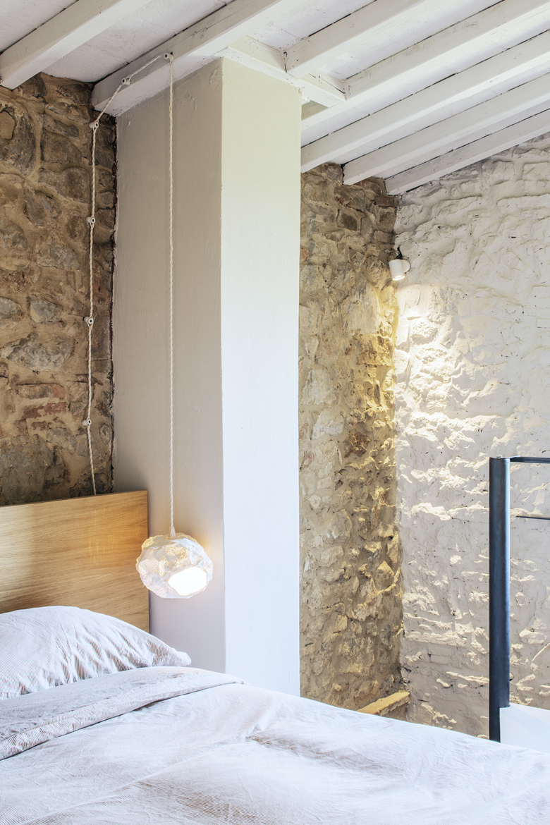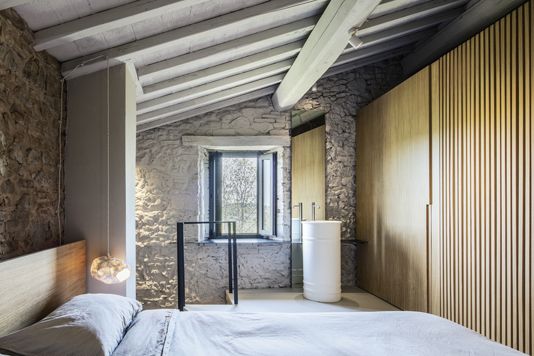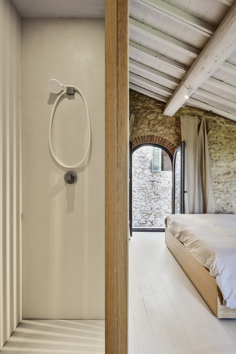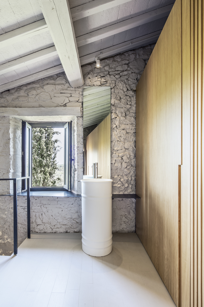 At the first floor the wardrobe has this task, both absolving a containing function and transforming into a space for WC and shower, in a light visual relationship with the bedroom thanks to the rarefaction of the wall.